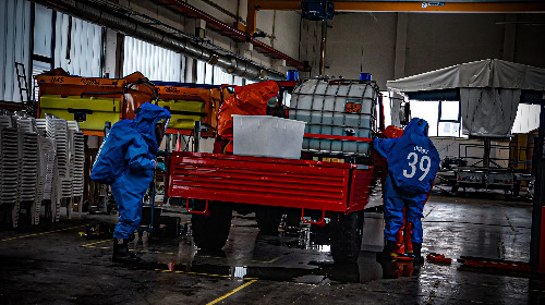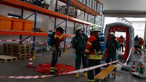 Vor Ort rüsteten sich zwei Trupps mit Atemschutz und Chemikalienschutzanzügen (CSA) aus. Mit dieser Schutzbekleidung können die Einsatzkräfte gefahrlos Maßnahmen im unmittelbaren Gefahrenbereich durchführen.