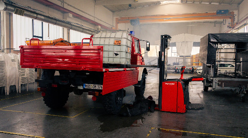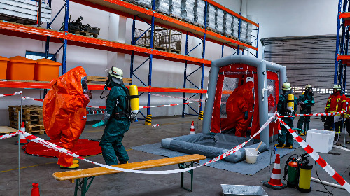 Hierfür führen wir auf dem Abrollbehälter Gefahrgut unter anderem ein Duschzelt mit.