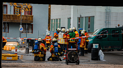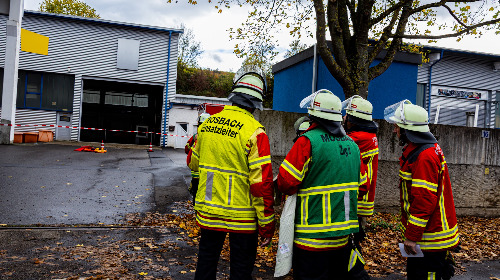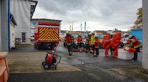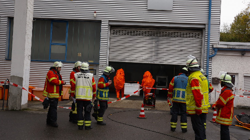 Vor Ort rüsteten sich zwei Trupps mit Atemschutz und Chemikalienschutzanzügen (CSA) aus. Mit dieser Schutzbekleidung können die Einsatzkräfte gefahrlos Maßnahmen im unmittelbaren Gefahrenbereich durchführen.
