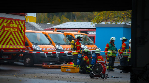 Die Übung begann mit der Alarmierung der Abteilung Mosbach-Stadt zu einer unter einem Stapler eingeklemmten Person. Hierfür fuhren das Löschfahrzeug LF 20/16 sowie der Rüstwagen die Einsatzstelle an.