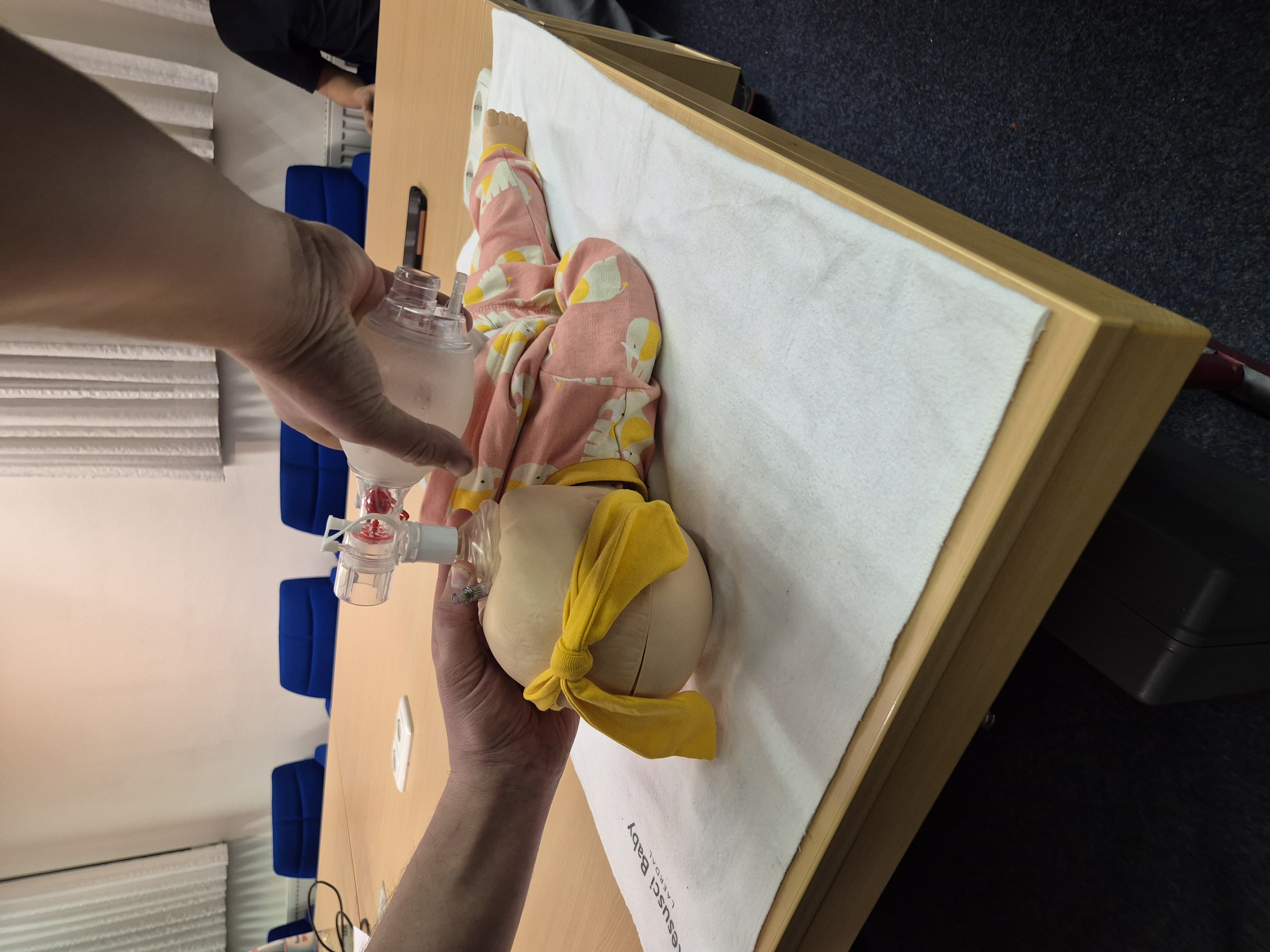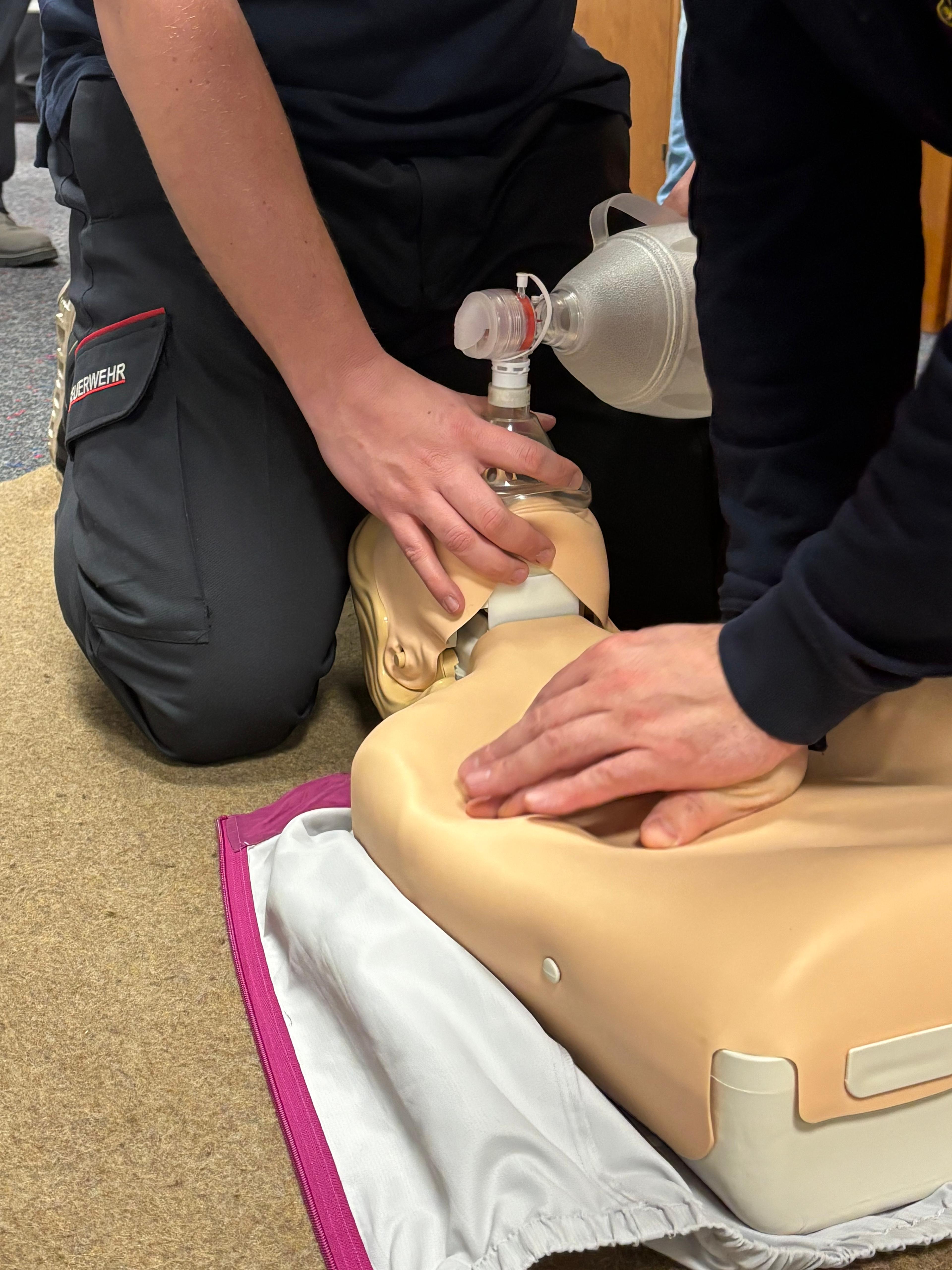 Ebenso wurde der Umgang mit dem Beatmungsbeutel trainiert. Dabei lag der Fokus auf der richtigen Technik, einer effektiven Beatmung sowie der Teamarbeit zwischen Atemwegsmanagement und Herzdruckmassage.