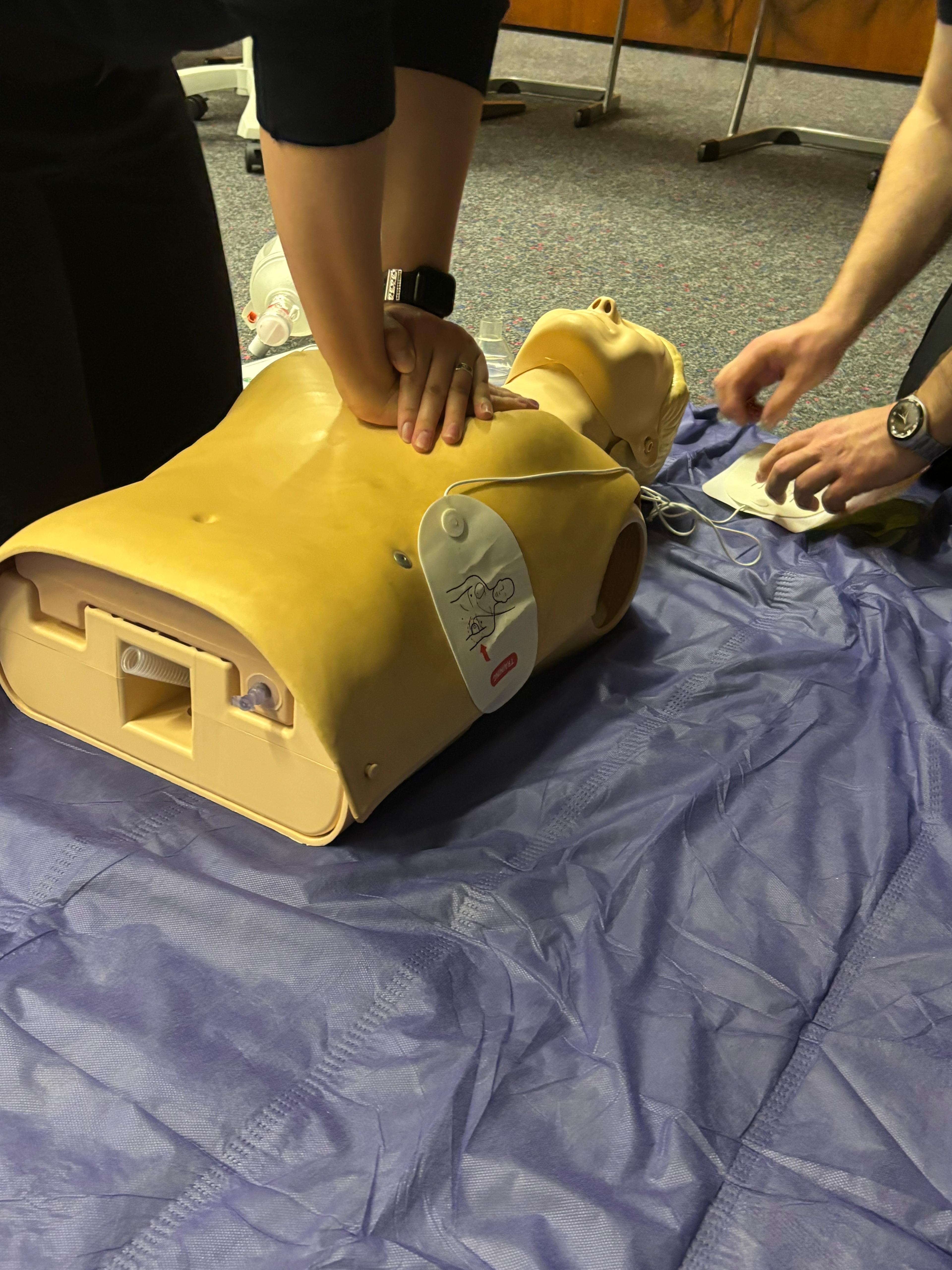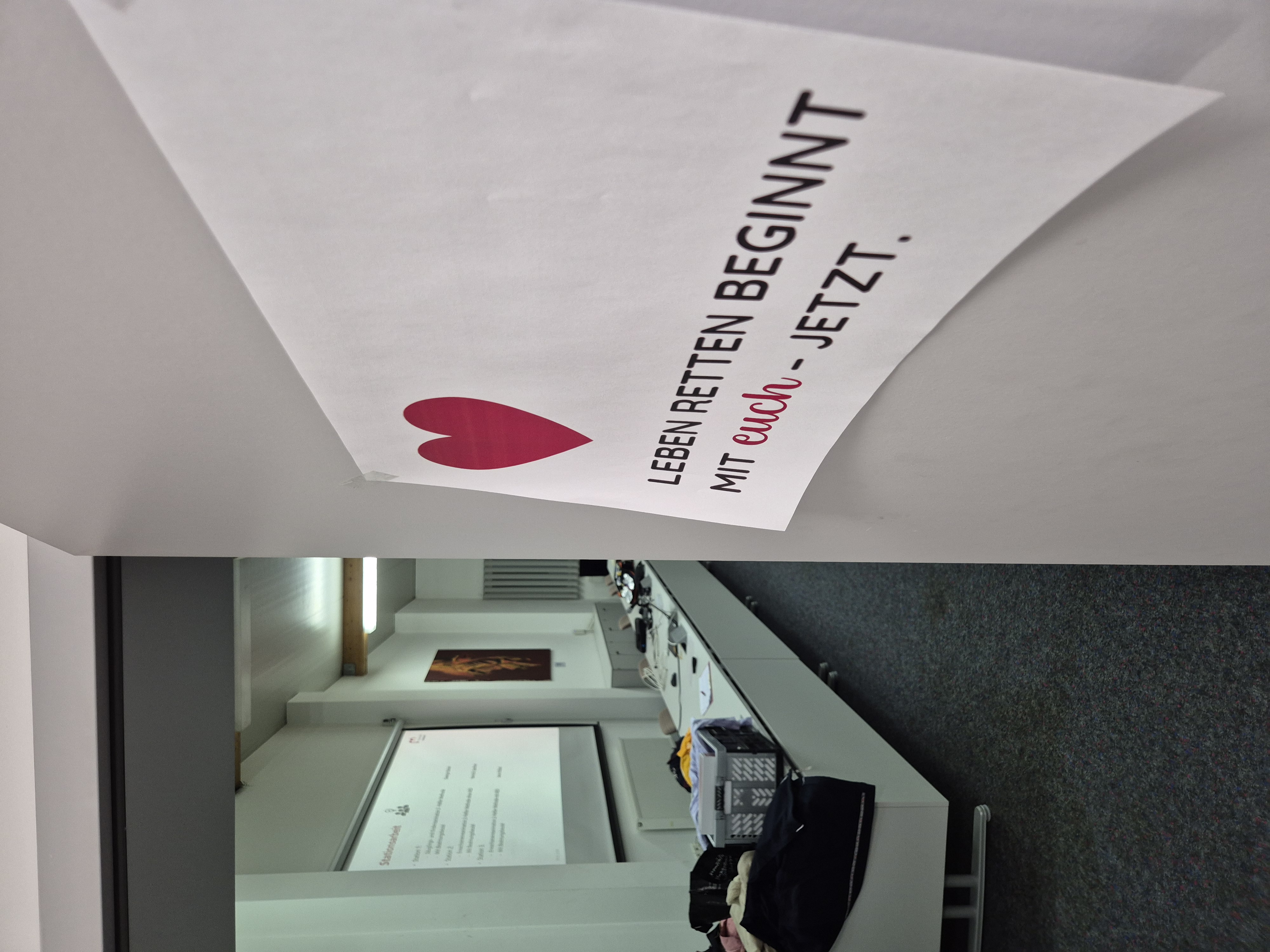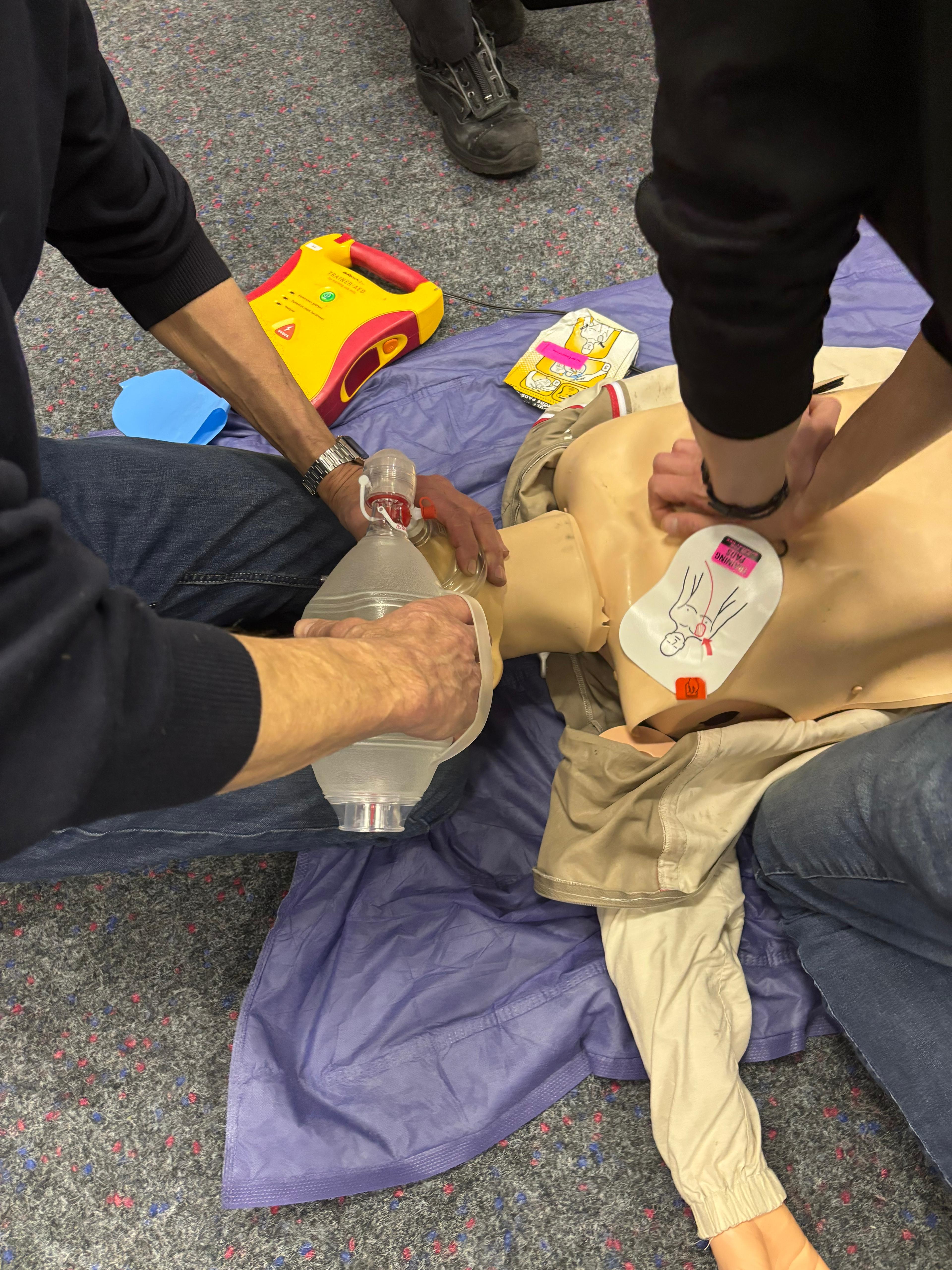 Ein Schwerpunkt lag auf dem sicheren Umgang mit dem AED (Automatisierter Externer Defibrillator). Von der Inbetriebnahme über die korrekte Platzierung der Elektroden bis hin zum strukturierten Ablauf während einer Reanimation wurde jeder Handgriff geübt. Ziel war es, im Ernstfall ruhig, schnell und routiniert handeln zu können.